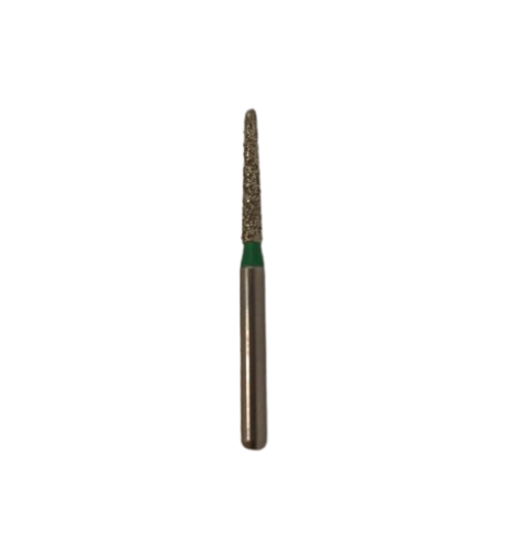 Конусовидная рабочая часть толщиной 1,4 мм гарантирует точность манипуляций. Стандартная фракция алмазного покрытия придает ровный срез, а прочный хвостовик четко фиксируется, выдерживая скорости вращения до 450 тыс. оборотов в минуту без биения.