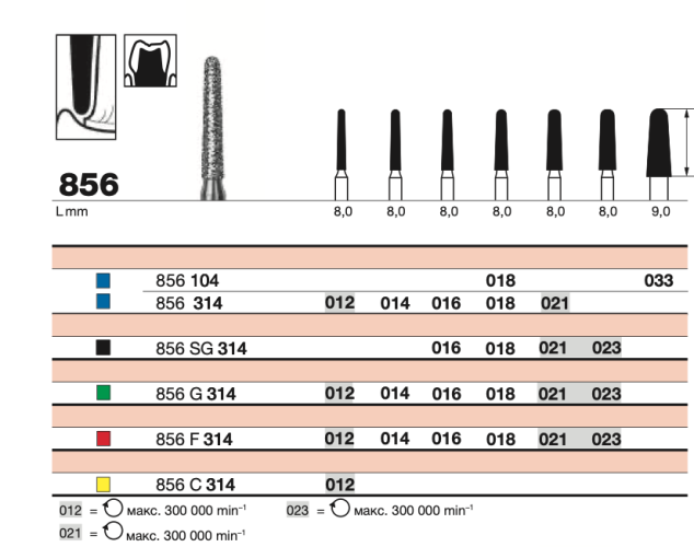 Алмазный бор ECO /E 856 SC 314.018 разработан для обработки твёрдых тканей зуба. Он применяется при препарировании полостей и подготовке поверхностей. Конусовидная форма с закругленным концом обеспечивает удобное и безопасное применение.