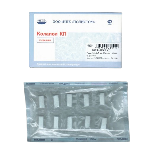Колапол КП – материал, представленный в губчатых фрагментах, обеспечивающий эффективный гемостаз в костной ткани. Применяется в хирургической стоматологии и имплантологии, а также при травмах. К преимуществам препарата Колапол относят его отличную биосовместимость, поэтому материал не отторгается и не вызывает аллергических реакций. Кроме кровоостанавливающего эффекта он успешно стимулирует остеогенез.